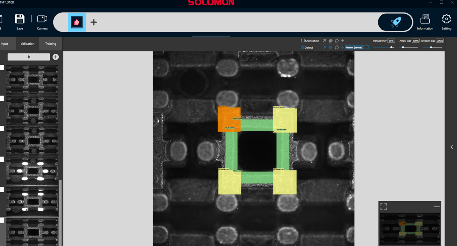 En utilisant l’outil de segmentation d’instances de SolVision, les lignes irrégulières et les défauts de perçage multiple sont étiquetés dans des images d’échantillon pour entraîner le modèle d’IA.