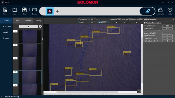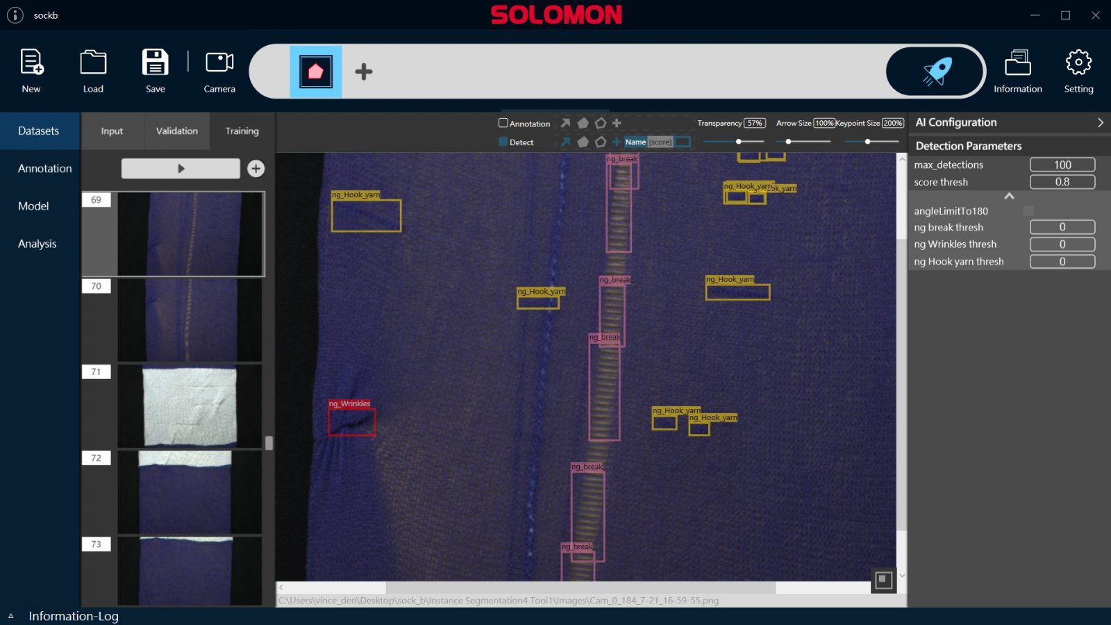 AIモデルの学習には、靴下のフックやシワなどの欠陥の画像を収集するSolVisionのSegmentation技術を使用します。 これにより、欠陥の迅速かつ正確な特定、異なる欠陥の分類、不良品の排除が可能となり、製品品質の管理と生産効率の向上を実現します。