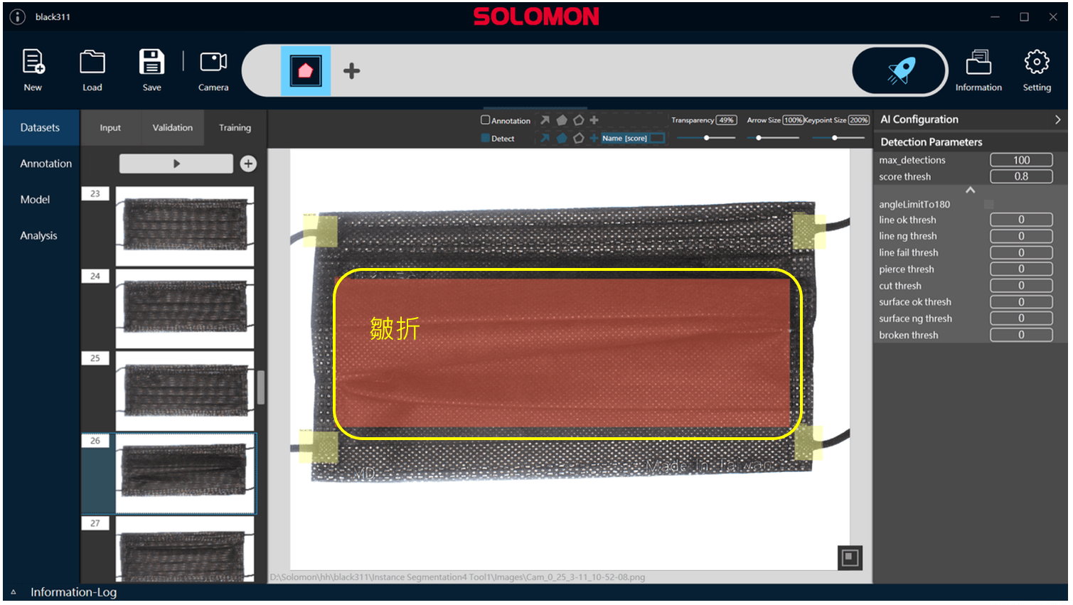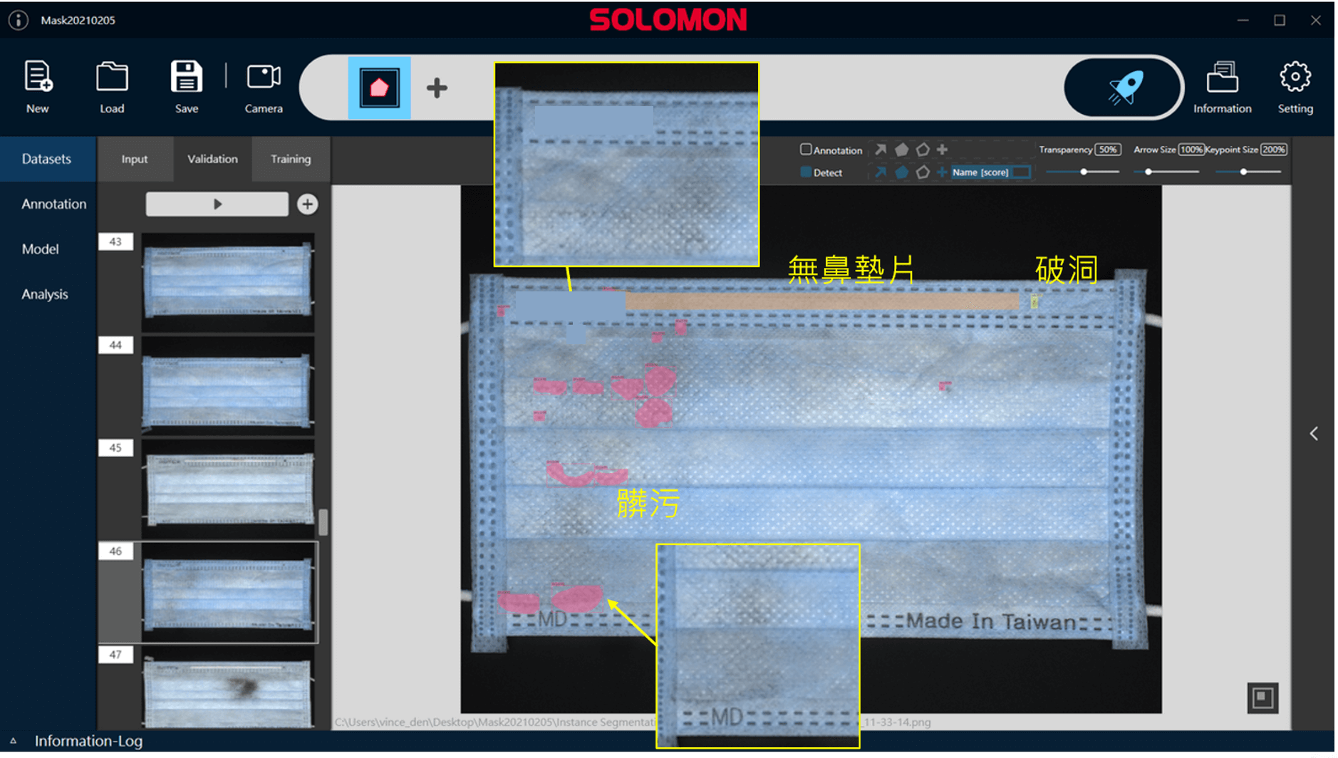 運用所羅門 SolVision AI影像平台的Segmentation技術,將影像樣本中各類型瑕疵予以標註並藉以訓練AI模型,經深度學習後即可於品管端精準辨識口罩上是否有瑕疵,進而將不良品汰除。