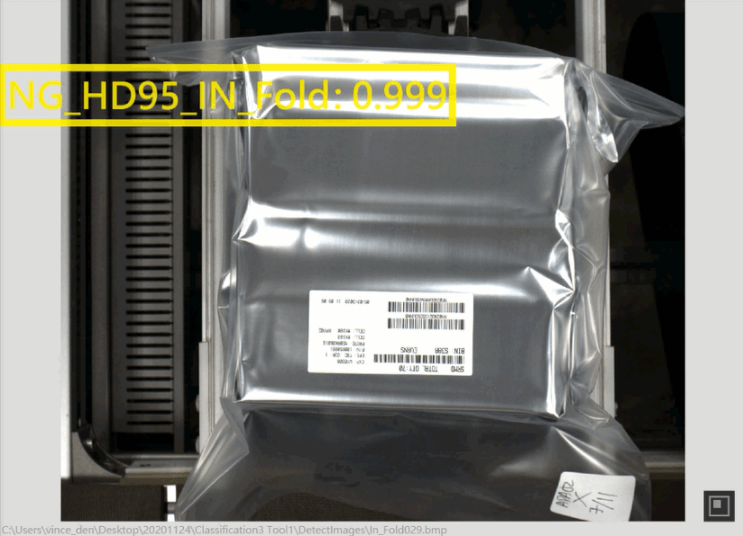 所羅門結合機器視覺與人工智慧使用 SolVision 的Classification工具,由影像定義出密封完好的狀態,並與多種缺陷作比較,包括下方密封不確實、下方與側邊皆未密封、下方與側邊密封不確實等,可即時檢出沒有密封完整的包裝並將缺陷分類。