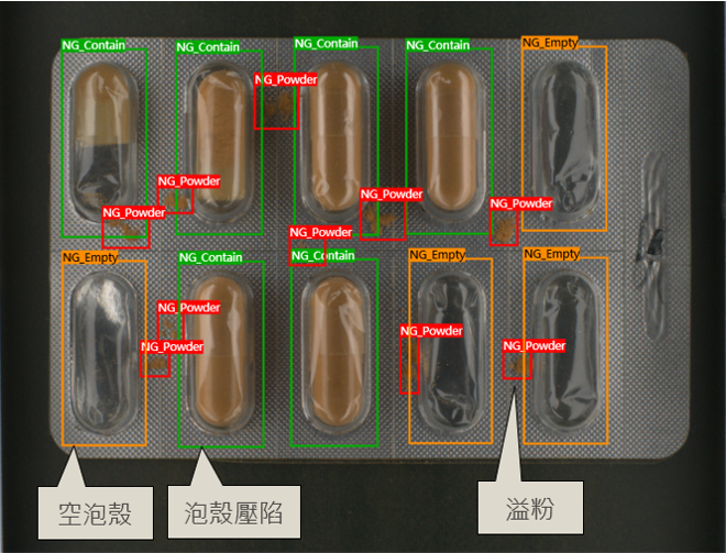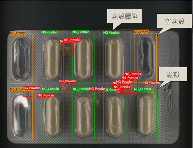 运用 SolVision AI影像平台的实例切割技术,以包装良品及具各种瑕疵类型的影像样本训练AI模型。训练完成的模型可即时且迅速地辨识每一泡壳的包装及填充情形,并将检测到的瑕疵予以标注并分类。